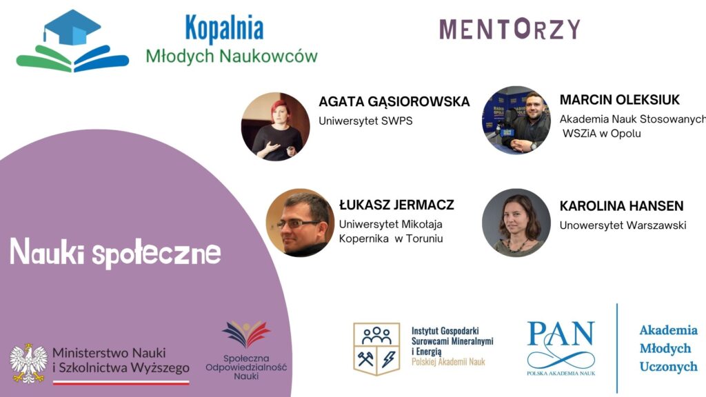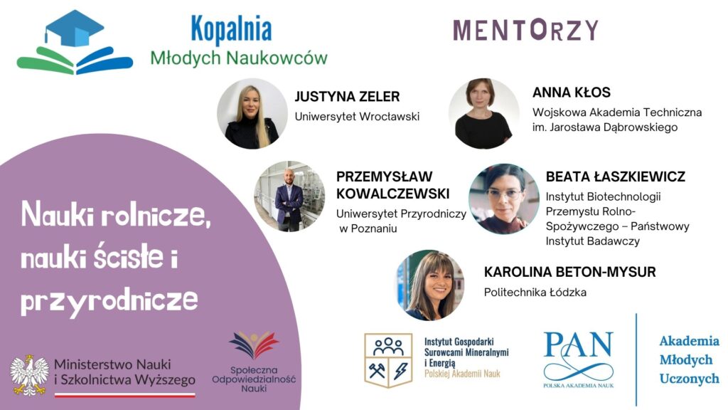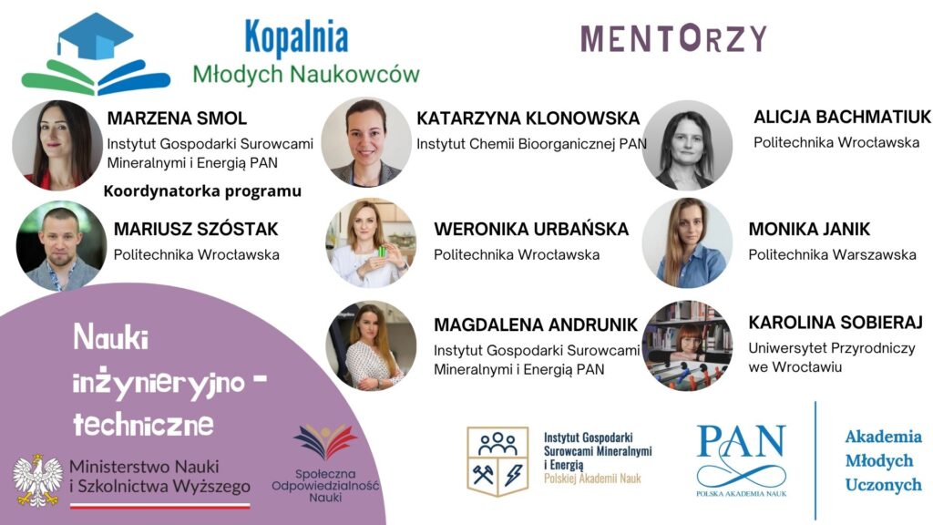 Projekt Kopalnia Młodych Naukowców uwzględnia część mentoringowo – szkoleniową pt. “Naukowiec to wspaniały zawód”, podczas której uczennice i uczniowie szkół ponadpodstawowych mają okazję uczestniczyć w spotkaniach z mentorami – Naukowcami z całej Polski. Poniżej przedstawiamy sylwetki naszych mentorów: